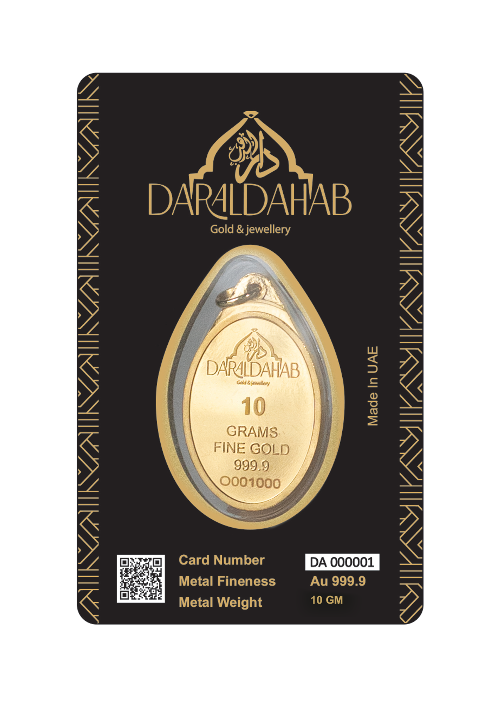 This 10 gram bar from Dar Al Dahab, sold exclusively by Gram Gold, is struck in 24 K (999.9) gold and presented in luxury packaging.